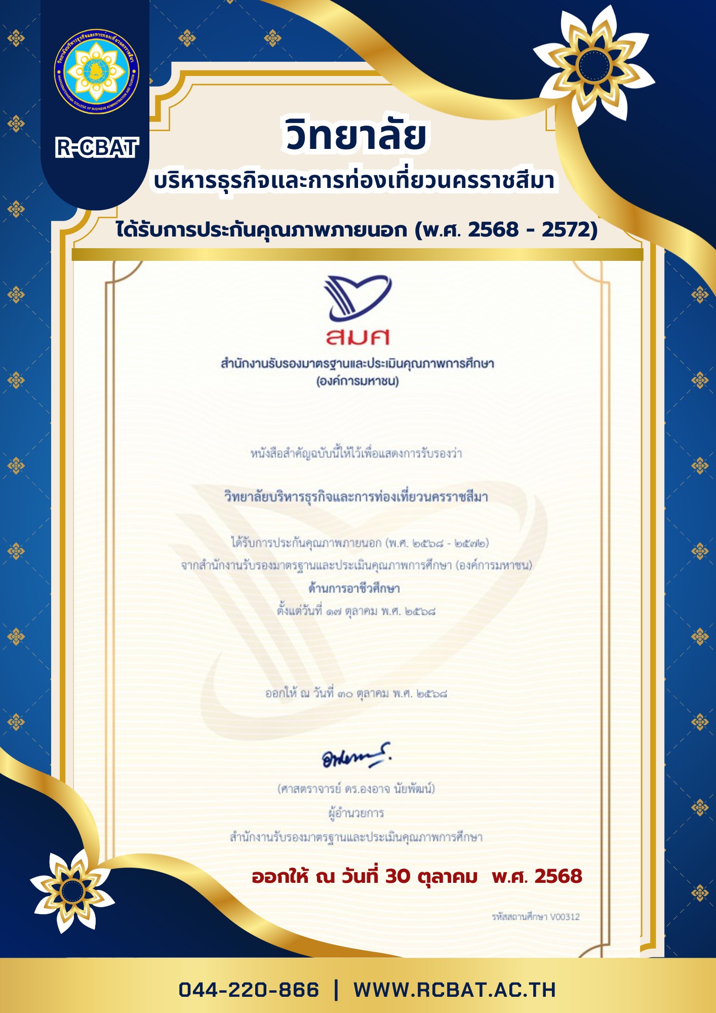 RCBAT-KM © 2013 วิทยาลัยบริหารธุรกิจและการท่องเที่ยวนครราชสีมา 197 ถนนเพชรมาตุคลา ตำบลมะเริง อำเภอเมือง จังหวัดนครราชสีมา 30000 โทร 044 - 220866 โทรสาร 044 - 220867 E-mail rcbat.mail@rcbat.ac.th