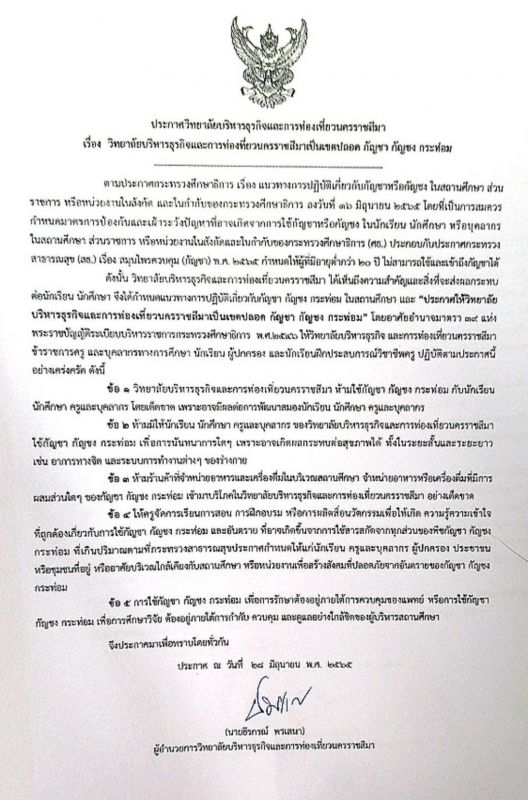 ประกาศ วิทยาลัยบริหารธุรกิจและการท่องเที่ยวนครราชสีมา เป็นเขตปลอด กัญชา กัญชง กระท่อม